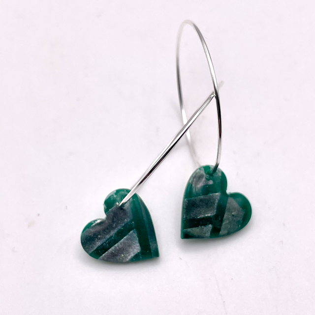 Gorgeous in green heart hoops! 3.5cm drop length on silver coloured hoops.