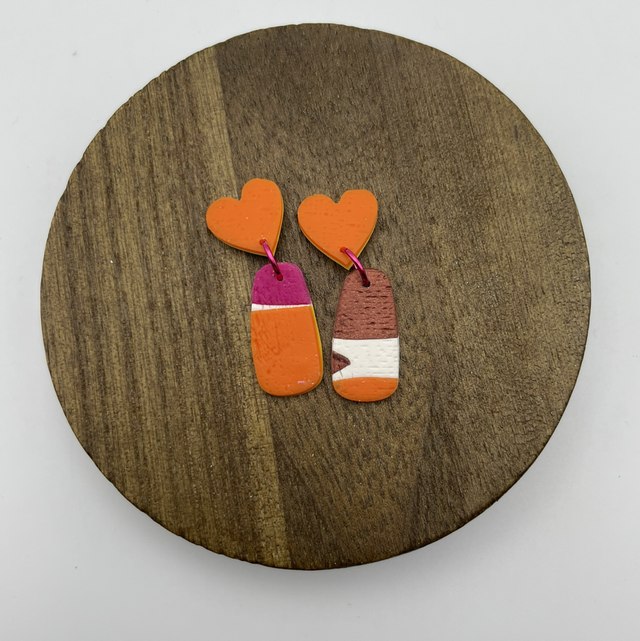 Gorgeous, bold pink, bronze and orange heart mini statement earrings. 3cm drop length with hypoallergenic stainless steel posts unless requested otherwise.