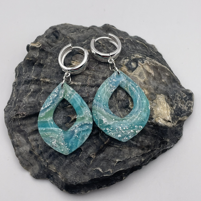 Beautiful midi drops, with silver foil. 4.5cm drop length with hypoallergenic sterling silver huggies.
