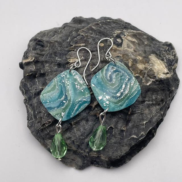 Beautiful midi drops, with silver foil and a green crystal bead. 5.5cm drop length with hypoallergenic sterling silver hooks.