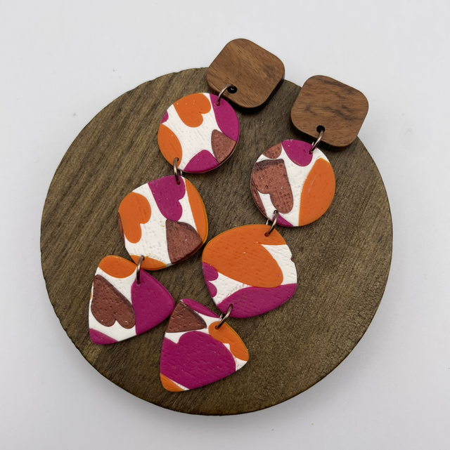 Stunning 8cm long statement drop earrings, with wooden studs and brown jump rings. These earrings say ‘look at me’ and leave you feeling fabulous when you’re wearing them!