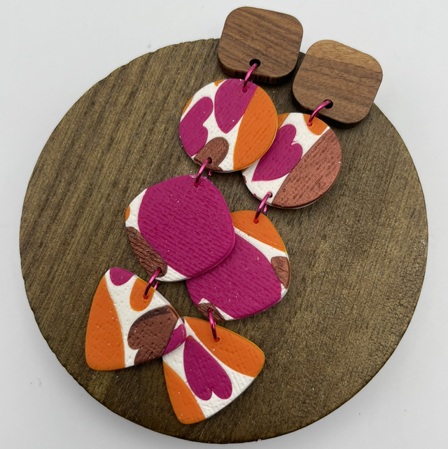 Stunning 8cm long statement drop earrings, with wooden studs and pink jump rings. These earrings say ‘look at me’ and leave you feeling fabulous when you’re wearing them!